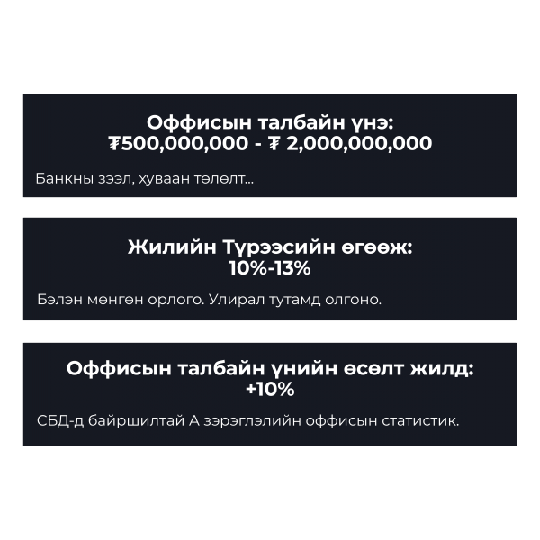 ТҮРЭЭСЛЭГЧТЭЙ ОФФИСЫН ТАЛБАЙД ХӨРӨНГӨ ОРУУЛЖ ӨМЧЛӨГЧ БОЛОХ БОЛОМЖ